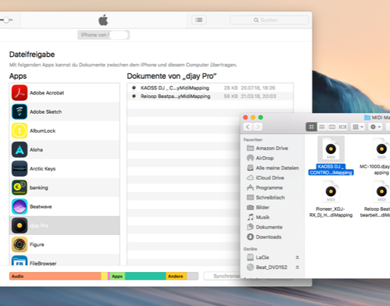 Anschließend iPad oder iPhone mit iTunes verbinden, Dateifreigabe aufrufen und dort auf djayPRO. Dann das Mapping einfach per Drag&Drop in den Bereich Dokumente von djayPRO ziehen und synchronisieren. FERTIG !